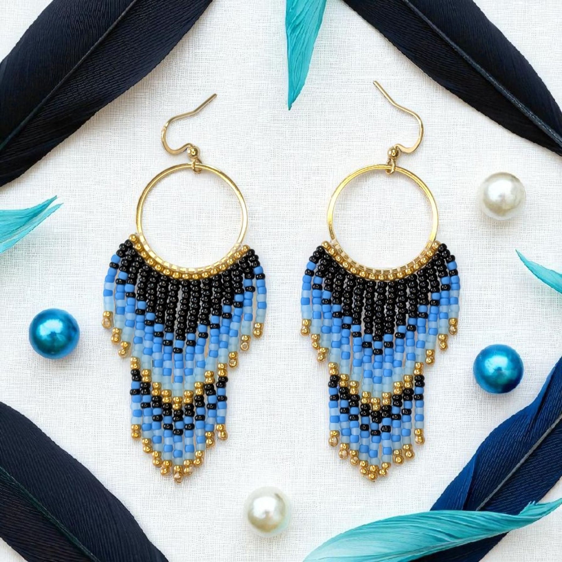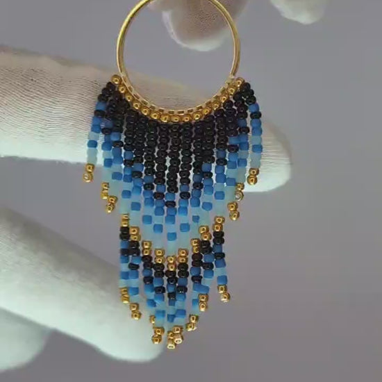 Deslumbra con la frescura y elegancia de los pendientes Amanecer Azul. Hechos a mano con delicadas cuentas de cristal en tonos negro, azul cielo y dorado, su diseño en forma de cascada evoca la belleza del cielo al amanecer. Montados en aros dorados ligeros y cómodos, son la combinación perfecta de estilo bohemio y sofisticación.
