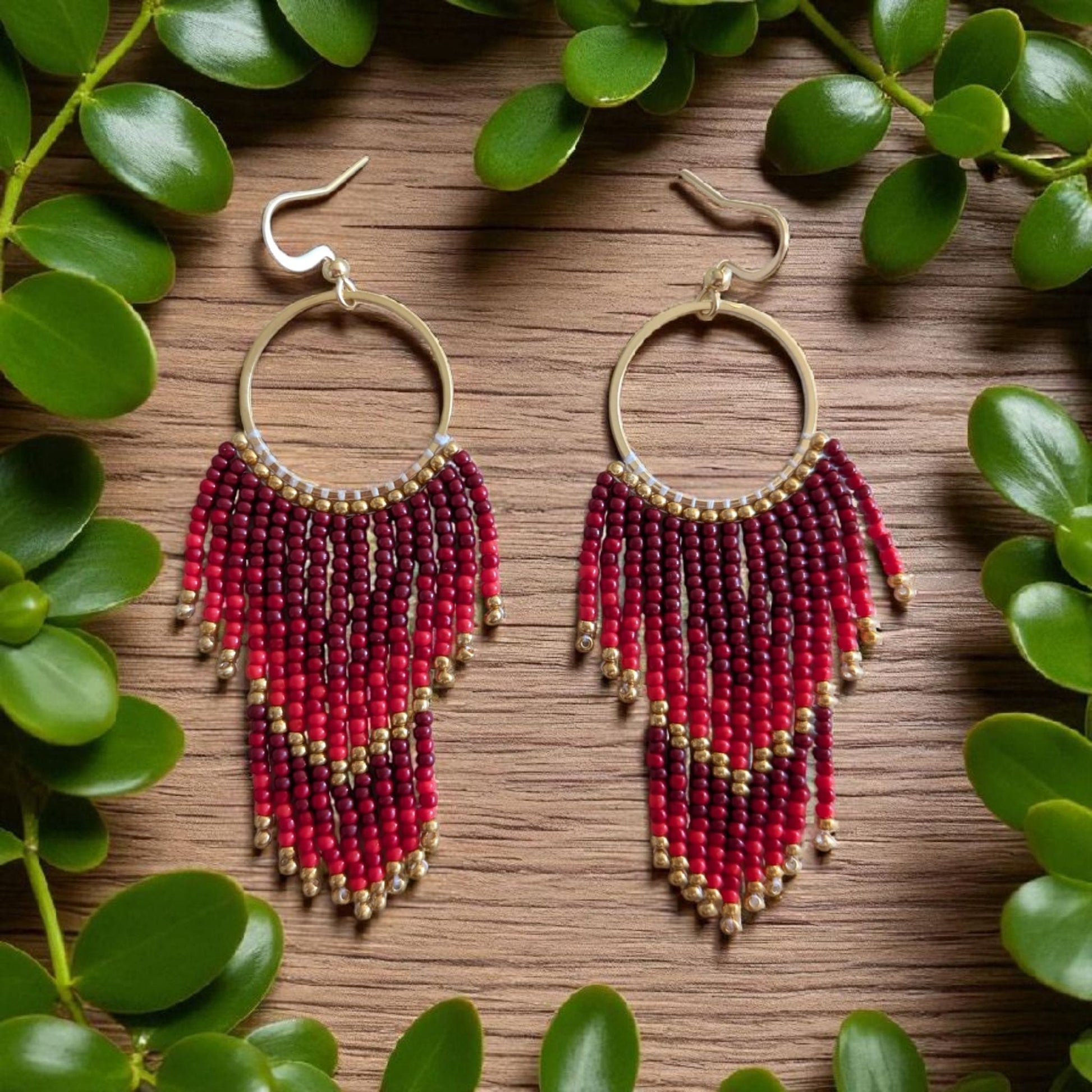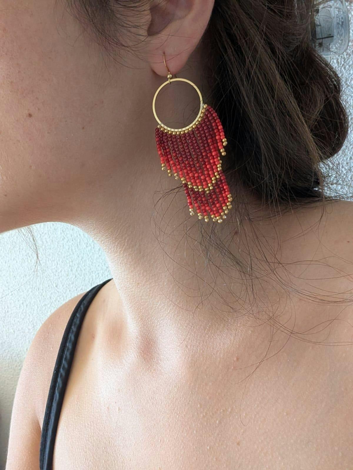 Despierta tu fuerza interior con los pendientes "Fuego Ancestral", una joya que evoca la intensidad del fuego y la elegancia de la tradición. Hechos a mano en tonos rojos ardientes y dorados, su diseño en forma de cascada fluida transmite energía, pasión y carácter.
